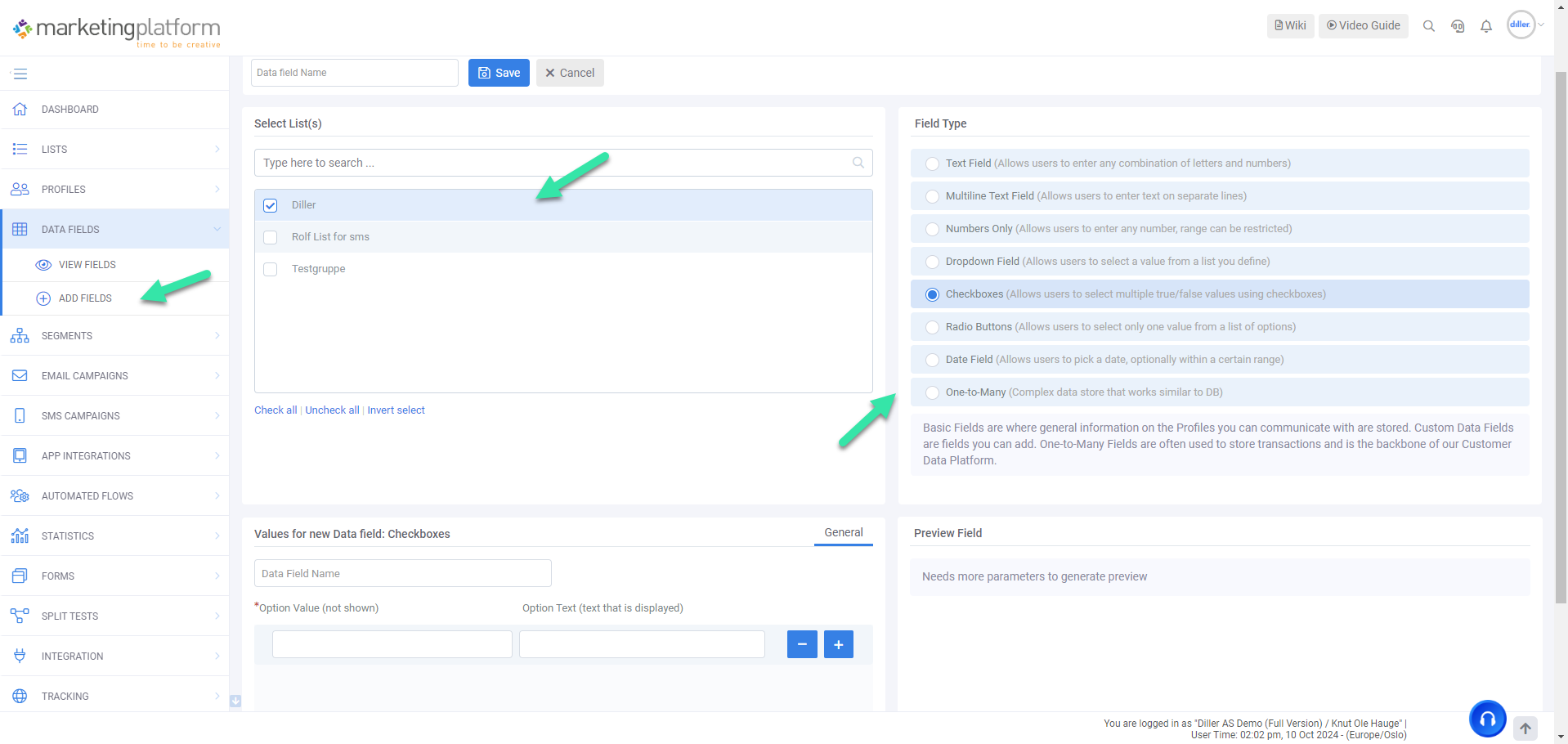A data field can be used in many ways in MarketingPlatform. Here we explain how you create the field, and how you use it in, for example, "Modify Forms".