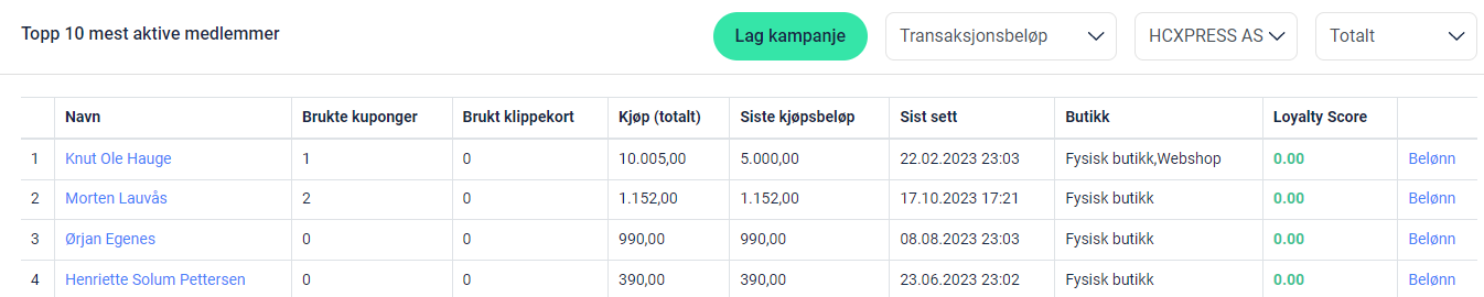 I Diller kontrollpanelet har du full oversikt over dine topp 10 mest aktive kundeklubb-medlemmer. Det vil si de som har handlet for mest hos deg. Disse kan du enkelt belønne ved en SMS-kampanje.