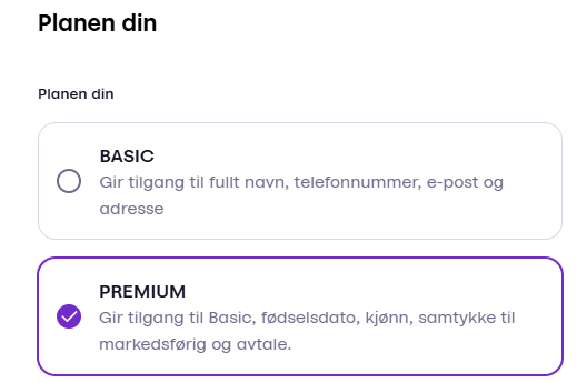 Steg 3. Rediger planen din til å bruke Premium for å få med bursdag, kjønn, samtykker rett ifra Vipps modulen.